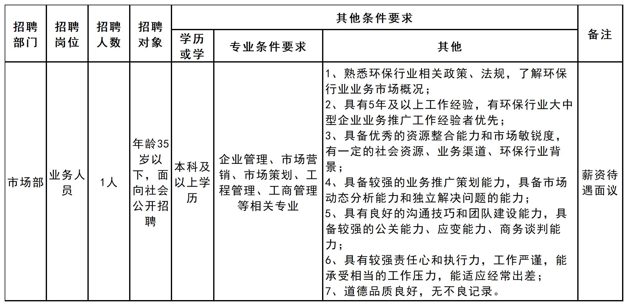 市場部 | 市場部業(yè)務員 | 1 | 面向社會公開招聘 | 不限 | 專業(yè)不限 | 1、具有企業(yè)市場營銷經(jīng)驗者優(yōu)先; 2、具備一定的社會資源、業(yè)務渠道、環(huán)保行業(yè)背景; 3、具備較強的業(yè)務推廣策劃能力,具備市場動態(tài)分析能力和獨立解決問題的能力; 4、具有良好的溝通技巧和團隊建設能力,具備較強的公關能力、應變能力、商務談判能力; 5、具有較強責任心和執(zhí)行力,工作嚴謹,能承受相當?shù)墓ぷ鲏毫Γ苓m應經(jīng)常出差; 6、能適應項目出差、項目外派等工作安排。